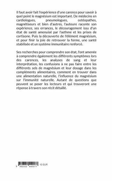 Il faut avoir fait l'expérience d'une carence pour savoir à quel point le magnésium est important. De médecins en cardiologues, pneumologues, ostéopathes, magnétiseurs et bien d'autres, l'auteure raconte son expérience, ses errances, le découragement issu d'un état de santé amenuisé par l'asthme et les prises de cortisone. Puis la découverte de l'élément magnésium, et pour finir la joie de retrouver la forme, une santé stabilisée et un système immunitaire renforcé.Ses recherches pour comprendre son état l'ont amenée à comprendre également les différents symptômes lors des carences, les analyses de sang et leur interprétation, les confusions à ne pas faire entre les différents sels de magnésium et leur dosage dans les compléments alimentaires, comment en trouver dans une alimentation naturelle, l'influence du magnésium sur l'immunité naturelle. Autant de questions que peuvent se poser les lecteurs et qui trouveront une réponse à travers son récit détaillé.
