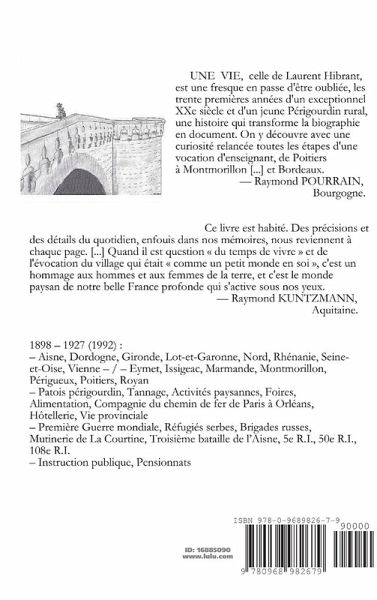 UNE VIE, celle de Laurent Hibrant, est une fresque en passe d'être oubliée, les trente premières années d'un exceptionnel XXe siècle et d'un jeune Périgourdin rural, une histoire qui transforme la biographie en document. On y découvre avec une curiosité relancée toutes les étapes d'une vocation d'enseignant, de Poitiers à Montmorillon [...] et Bordeaux. (Raymond POURRAIN, Bourgogne.) Ce livre est habité. Des précisions et des détails du quotidien, enfouis dans nos mémoires, nous reviennent à chaque page. [...] Quand il est question du temps de vivre et de l'évocation du village qui était comme un petit monde en soi , c'est un hommage aux hommes et aux femmes de la terre, et c'est le monde paysan de notre belle France profonde qui s'active sous nos yeux. (Raymond KUNTZMANN, Aquitaine.) - Préface, Cartes, Photos, Dessins, Notes, Gloss., Bibliogr., Index.
