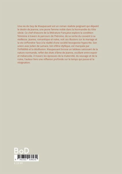 Une vie de Guy de Maupassant est un roman réaliste poignant qui dépeint le destin de Jeanne, une jeune femme noble dans la Normandie du XIXe siècle. Ce chef-d'oeuvre de la littérature française explore la condition féminine à travers le parcours de l'héroïne, de sa sortie du couvent à sa vieillesse. Jeanne, romantique et naïve, voit ses illusions sur le mariage et la vie s'effondrer face à la réalité d'une société bourgeoise hypocrite. Son union avec Julien de Lamare, loin d'être idyllique, est marquée par l'infidélité et la désillusion. Maupassant brosse un tableau saisissant de la nature normande, reflet des états d'âme de Jeanne, oscillant entre espoir et mélancolie. À travers les épreuves de la maternité, du veuvage et de la ruine, l'auteur livre une réflexion profonde sur le temps qui passe et la résignation. Une vie s'inscrit dans la tradition des grands romans d'apprentissage, offrant une critique acerbe de la société de son époque tout en explorant les profondeurs de l'âme humaine.