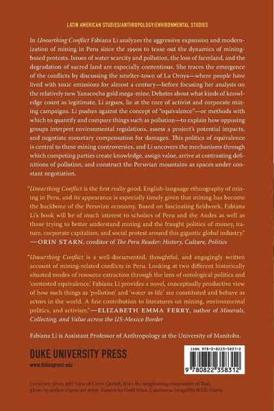 In Unearthing Conflict Fabiana Li analyzes the aggressive expansion and modernization of mining in Peru since the 1990s to tease out the dynamics of mining-based protests. Issues of water scarcity and pollution, the loss of farmland, and the degradation of sacred land are especially contentious. She traces the emergence of the conflicts by discussing the smelter-town of La Oroya-where people have lived with toxic emissions for almost a century-before focusing her analysis on the relatively new Yanacocha gold mega-mine. Debates about what kinds of knowledge count as legitimate, Li argues, lie at the core of activist and corporate mining campaigns. Li pushes against the concept of "equivalence"-or methods with which to quantify and compare things such as pollution-to explain how opposing groups interpret environmental regulations, assess a project's potential impacts, and negotiate monetary compensation for damages. This politics of equivalence is central to these mining controversies, and Li uncovers the mechanisms through which competing parties create knowledge, assign value, arrive at contrasting definitions of pollution, and construct the Peruvian mountains as spaces under constant negotiation.