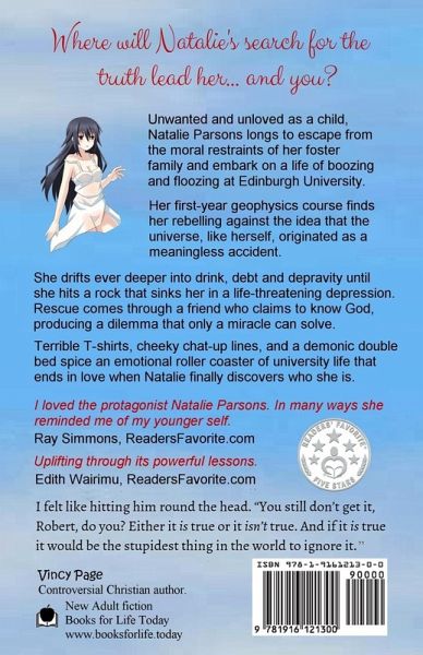 Unwanted and unloved as a child, Natalie Parsons longs to escape from the moral restraints of her foster family and embark on a life of boozing and floozing at Edinburgh University. Her first-year geophysics course finds her rebelling against the idea that the universe, like herself, originated as a meaningless accident. Helped and hindered by good and bad friends, Natalie drifts ever deeper into drink, debt and depravity until she hits a rock that sinks her in a life-threatening depression. Rescue comes through a student who claims to know God, producing a dilemma that only a miracle can solve. Terrible T-shirts, cheeky chat-up lines and a demonic double bed spice an emotional roller coaster of university life that ends in love when Natalie finally discovers who she is.
