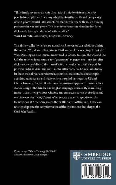 This timely collection of essays examines Sino-American relations during the Second World War, the Chinese Civil War and the opening of the Cold War. Drawing on new sources uncovered in China, Taiwan, the UK and the US, the authors demonstrate how 'grassroots' engagements - not just elite diplomacy - established the trans-Pacific networks that both shaped the postwar order in Asia, and continue to influence Sino-US relations today. In these crucial years, servicemen, scientists, students, businesspeople, activists, bureaucrats and many others travelled between the US and China. In every chapter, this innovative volume's approach uncovers their stories using both Chinese and English language sources. By examining interactions among various Chinese and American actors in the dynamic wartime environment, Uneasy Allies reveals a new perspective on the foundations of American power, the brittle nature of the Sino-American relationship, and the early formation of the institutions that shaped the Cold War Pacific.