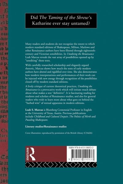 Unediting the Renaissance is a path-breaking and timely look at the issues of the textual editing of Renaissance works. Both erudite and accessible, it will be a fascinating and provocative read for any Renaissance student or scholar. Leah Marcus argues that `bad' versions of Renaissance texts such as Shakespeare's First Folio should not be viewed as mutilated copies of originals, but rather reputable alternatives encoding differences in ideology, cultural meaning and other elements of performance. Marcus focuses on key Renaissance works- Dr Faustus, The Merry Wives of Windsor, The Taming of the Shrew, Hamlet and poems by Milton, Donne and Herrick - to re-exmaine how editorial intervention shapes the texts which are widely accepted as `definitive'. Examining the cultural attitudes, fears and influences which influence textual editors, from the seveteenth century to the present day, Marcus sheds new light on a previously unexamined aspect of Renaissance studies. A lively critique of current theoretical practices, Unediting the Renaissance will shift the ways in which Shakespeare and his contemporaries are edited and read.