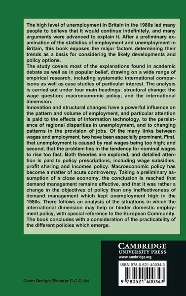 The high level of unemployment in Britain in the 1980s led many people to believe that it would continue indefinitely, and many arguments were advanced to explain it. After a preliminary examination of the statistics of employment and unemployment in Britain, this 1991 book exposes the major factors determining their trends as a basis for considering the likely developments and policy options. The study covers most of the explanations found in academic debate as well as in popular belief, drawing on a wide range of empirical research, including systematic international comparisons as well as case studies of particular interest. The analysis is carried out under four main headings: structural change; the wage question; macroeconomic policy; and the international dimension. The book concludes with a consideration of the practicability of the different policies which emerge.