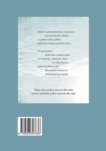 Näen unia, jotka voisivat olla totta, kerron tarinoita, jotka voisivat olla unta. 'Talveksi kirjotaan unille peitto syksyn ateljeen uusia kuvioita hallan puhallus ruovikossa lehtien värikkäät hyvästit, ja miten vaipuva aurinko taikookaan kultaa haapojen lehvästöviittaan.'