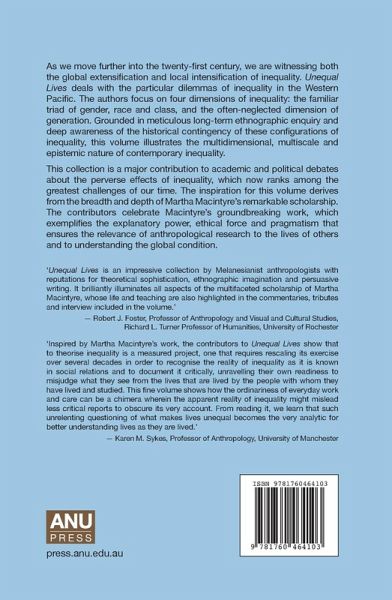 As we move further into the twenty-first century, we are witnessing both the global extensification and local intensification of inequality. Unequal Lives deals with the particular dilemmas of inequality in the Western Pacific. The authors focus on four dimensions of inequality: the familiar triad of gender, race and class, and the often-neglected dimension of generation. Grounded in meticulous long-term ethnographic enquiry and deep awareness of the historical contingency of these configurations of inequality, this volume illustrates the multidimensional, multiscale and epistemic nature of contemporary inequality. This collection is a major contribution to academic and political debates about the perverse effects of inequality, which now ranks among the greatest challenges of our time. The inspiration for this volume derives from the breadth and depth of Martha Macintyre's remarkable scholarship. The contributors celebrate Macintyre's groundbreaking work, which exemplifies the explanatory power, ethical force and pragmatism that ensures the relevance of anthropological research to the lives of others and to understanding the global condition.