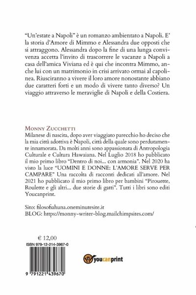 "Un'estate a Napoli" è un romanzo ambientato a Napoli. E' la storia d'Amore di Mimmo e Alessandra due opposti che si attraggono. Alessandra dopo la fine di una lunga convivenza accetta l'invito di trascorrere le vacanze a Napoli a casa dell'amica Viviana ed è qui che incontra Mimmo, anche lui con un matrimonio in crisi arrivato ormai al capolinea. Riusciranno a vivere il loro amore nonostante abbiano due caratteri forti e un modo di vivere tanto diverso? Un viaggio attraverso le meraviglie di Napoli e della Costiera. PAGINA FACEBOOK: Antropologia Huna e Gatti - Scrittrice Sito: filosofiahuna.oneminutesite.it BLOG: https://monny-writerblog.mailchimpsites.com