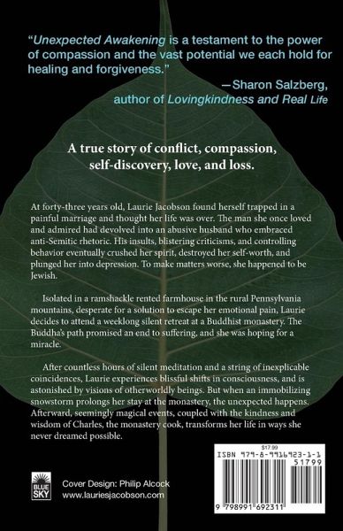 Discover a courageous journey that will inspire your own healing, personal and spiritual growth, and self-discovery. "Unexpected Awakening is a testament to the power of compassion and the vast potential we each hold for healing and forgiveness." -Sharon Salzberg, author of Lovingkindness and Real Life At forty-three, Laurie Jacobson believed her life was over. Trapped in a remote farmhouse in rural Pennsylvania, she was married to a man who had once inspired her, but who had become emotionally abusive and increasingly hostile toward her Jewish identity. Feeling isolated, broken, and desperate for relief, she makes a bold decision: to attend a silent retreat at a Buddhist monastery in the mountains of West Virginia. In Unexpected Awakening, readers are taken on an intimate journey of healing, personal growth, spiritual renewal, and self-discovery. Through quiet mornings, humble chores, sacred chants, and meditation, she begins to unlock the wisdom and courage that had been within her all along. In this immersive, inspiring memoir you'll discover:What it's like to live inside a Buddhist monastery How mindfulness and meditation can release trauma stored in the body Honest reflections on emotional abuse, resilience, and self-compassion A path to gain peace of mind, clarity, and insight If you've ever longed for freedom, peace, or the courage to begin again, this unforgettable memoir will meet you where you are, and gently walk you home to yourself.
