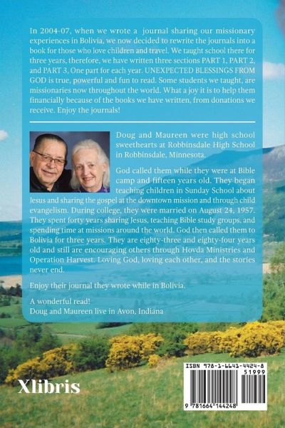 In 2004-07, when we wrote a journal sharing our missionary experiences in Bolivia, we now decided to rewrite the journals into a book for those who love children and travel. We taught school there for three years, therefore, we have written three sections PART 1, PART 2, and PART 3, One part for each year. UNEXPECTED BLESSINGS FROM GOD is true, powerful and fun to read. Some students we taught, are missionaries now throughout the world. What a joy it is to help them financially because of the books we have written, from donations we receive. Enjoy the journals!
