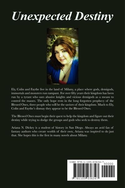 Ely, Colin and Faythe live in the land of Milany, a place where gods, demigods, immortals and monsters run rampant. For over fifty years their kingdom has been run by a tyrant who uses abusive knights and vicious demigods as a means to control the masses. The only hope rests in the long forgotten prophecy of the Blessed Ones, three people who will be the saviors of their kingdom. Much to Ely, Colin and Faythe%u2019s dismay they appear to be the Blessed Ones. The Blessed Ones must begin their quest to help the kingdom and figure out their destiny while trying to dodge the groups and gods who seek to destroy them.