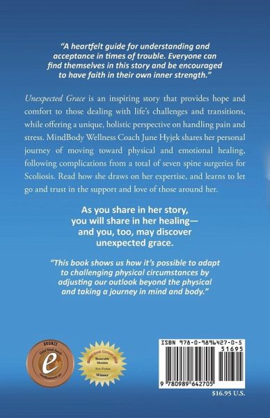 Unexpected Grace is an inspiring story that provides hope and comfort to those dealing with life's challenges and transitions, while offering a unique, holistic perspective on handling pain and stress. MindBody Wellness Coach June Hyjek shares her personal journey of moving toward physical and emotional healing, following complications from a total of seven spine surgeries for Scoliosis. Read how she draws on her expertise, and learns to let go and trust in the support and love of those around her. Note from Author: This book is not religious and allows each reader to interpret and integrate the concepts and lessons within their own personal belief structure.