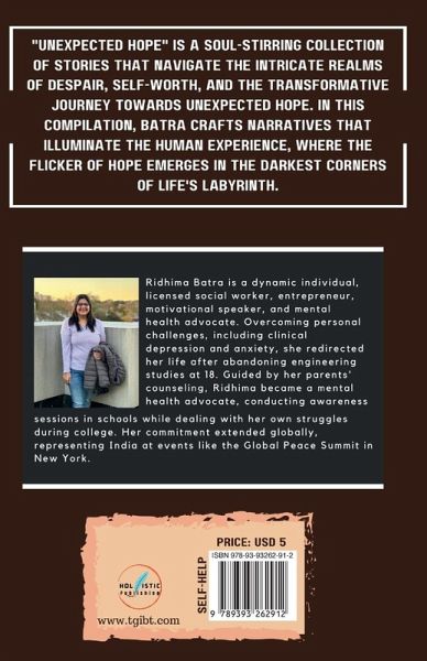 "Unexpected Hope" is a soul-stirring collection of stories that navigate the intricate realms of despair, self-worth, and the transformative journey towards unexpected hope. In this compilation, Batra crafts narratives that illuminate the human experience, where the flicker of hope emerges in the darkest corners of life's labyrinth.