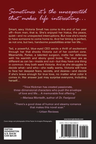 Sometimes it’s the unexpected that makes life interesting… Smart, sexy Victoria Small has come to the end of her year off—from men, that is. She’s enjoyed her hiatus, the peace, quiet—and no unexpected interruptions. But now she’s ready to have someone to come home to. And her timing is perfect, as not one, but two, handsome possibilities enter her life… Ted, a powerful, blue-eyed CEO sends a thrill of excitement through her that shocks Victoria out of her comfort zone. Meanwhile, Parker, a talented surgeon, melts her defenses with his warmth and ebony good looks. The men are as different as can be—inside and out—but they have one thing in common: they both want Victoria. And as she struggles to decide what—and who—she really wants, Victoria will have to face her deepest fears, secrets, and desires—and decide if she’s brave enough for true love, no matter what color it comes in. Her answer just may surprise everyone, including herself… "Trice Hickman has created passionate, three-dimensional characters who push the envelope of love and life… A memorable first offering." —Marissa Monteilh, author of Dr. Feelgood "There’s a good dose of humor and steamy romance that makes this novel soar." —Urban Reviews