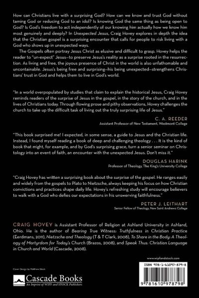 How can Christians live with a surprising God? How can we know and trust God without taming God or reducing God to an idol? Is knowing God the same thing as being open to God? Is God's freedom to act independently of our knowing him actually how we know him most genuinely and deeply? In Unexpected Jesus, Craig Hovey explores in depth the idea that the Christian gospel is a surprising encounter that calls for people to risk living with a God who shows up in unexpected ways. The Gospels often portray Jesus Christ as elusive and difficult to grasp. Hovey helps the reader to ""un-expect"" Jesus--to preserve Jesus's reality as a surprise rooted in the resurrection. As living and free, the joyous presence of Christ in the world is also unfathomable and uncontainable. Jesus's being free and surprising--unexpected--strengthens Christians' trust in God and helps them to live in God's world.