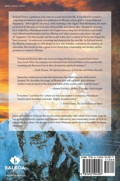Richard Prince, a professor, had come to a dead end in his life. It was then he received a surprising invitation to speak at a conference in Bhutan, whose goal is "Gross National Happiness." Although he’s skeptical, while trekking to the Tiger’s Nest Monastery, the most revered of all Bhutan’s spiritual sites, Richard falls and almost dies. During his recovery, he is visited by a Himalayan master who begins instructing him on the keys to personal and cultural transformation and how Bhutan and other countries can achieve the goal of "happiness" for their people and the world. Little does he know it, but he has begun the "hero’s journey" to rediscover a meaning and purpose for his own life. As Richard travels the Bhutan countryside, he falls deeply in love with Sumitra, assistant to the minister of education. She reveals to him a great secret about their relationship and destiny, and he promises to return to Bhutan. "Unexpected Journey takes you on an exciting adventure to a mystical land where East meets West. Accompany our reluctant hero, Richard Prince as he searches for meaning and discovers love in this adventurous spiritual romance." —Ruth Drayer, The Spiritual Journeys of Nicholas and Helena Roerich "James has written an account that showcases the salient features of the hero’s journey. He describes the magic of Bhutan that will captivate and exhilarate readers ready to travel to the remotest lands of the world as well as of the heart." —Alanna Kaivalya, Author, Educator, Mythologist "A modern "Lost Horizons" where our hero encounters a mysterious Himalayan teacher and a beautiful soul mate. Highly recommended." —David Tame, The Secret Power of Music