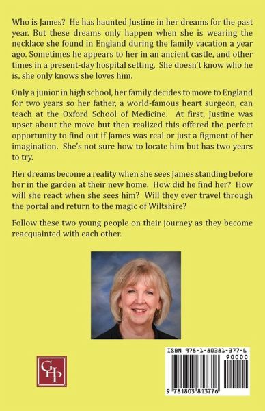 Who is James? He has haunted Justine in her dreams for the past year. But these dreams only happen when she is wearing the necklace she found in England during the family vacation a year ago. Sometimes he appears to her in an ancient castle, and other times in a present-day hospital setting. She doesn't know who he is, she only knows she loves him. Only a junior in high school, her family decides to move to England for two years so her father, a world-famous heart surgeon, can teach at the Oxford School of Medicine. At first, Justine was upset about the move but then realized this offered the perfect opportunity to find out if James was real or just a figment of her imagination. She's not sure how to locate him but has two years to try. Her dreams become a reality when she sees James standing before her in the garden at their new home. How did he find her? How will she react when she sees him? Will they ever travel through the portal and return to the magic of Wiltshire? Follow these two young people on their journey as they become reacquainted with each other.