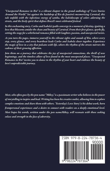 Embark on a captivating journey through 'Unexpected Romance in Rio,' where love blossoms amidst the vibrant energy of Carnival and transcends time and space. Follow Carlos and Isabela as they navigate the bustling streets of Rio de Janeiro, their hearts beating in harmony with the rhythm of the city. In 'First Glance at Carnival,' experience the magic of their first meeting, where sparks fly and destiny begins to weave its intricate web. As their love story unfolds in 'Echoes of Laughter and Music,' Carlos's melodies and Isabela's laughter fill the air, creating a symphony of emotions that captivate the soul. Travel with them through 'Whispers of the Heart,' where whispered secrets and shared dreams strengthen their bond, leading to moments of vulnerability and intimacy. In 'Dancing Under the Stars,' the night sky becomes a witness to their passion, as they sway to the music of their hearts and lose themselves in each other's embrace. As their journey takes unexpected turns in 'Crossroads of Fate,' Carlos and Isabela discover the beauty of serendipity, where chance encounters and synchronicities guide their path towards a deeper connection. 'Embracing the Unknown' brings moments of uncertainty and growth, as they face challenges that test their love and resilience. Through 'Lost in Translation,' misunderstandings and communication barriers are overcome, paving the way for deeper understanding and acceptance. 'A Glimpse of Eternity' offers a poetic reflection on the timeless nature of their love, a love that transcends the boundaries of time and space. As their story comes full circle in 'Everlasting Love,' Carlos and Isabela reflect on the depth and endurance of their love, celebrating the journey they've shared and the promise of a future filled with endless possibilities. Join them in 'Paths Intertwined,' where fate brings them closer together through unexpected encounters and shared experiences. And in 'Dreams Unfolding,' witness their dreams come to life as they envision a future filled with love, laughter, and new adventures yet to come. Finally, in the epilogue, 'The Invitation,' readers are invited to continue the journey with Carlos and Isabela, to discover what lies beyond the sunset and embrace the magic of love's endless possibilities. With each chapter connected seamlessly, 'Unexpected Romance in Rio' is not just a love story-it's an immersive experience that captures the essence of love, passion, resilience, and the beauty of shared moments. Get ready to be swept away on a whirlwind of emotions and adventures, as Carlos and Isabela's love story unfolds before your eyes.