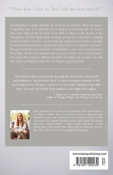 (Un)Faithful is a guide through the firestorm of infidelity. Ruth Erickson's compelling story of heartbreak and healing is an invitation for all women who have suffered the betrayal of an affair to discover the depths of the faithfulness of God. Ruth offers wisdom, perspective, and hope, standing years beyond her own fire, yet the book also journeys back in time to include riveting and honest poetry and journal entries from her real-time experience. Wrapped in forgiveness and faith, (Un)Faithful is a raw and reverent journey to healing, whether the marriage survives or not. While every story is unique, this book offers timeless, biblical principles by which any woman can walk into safety and dignity under the covering of a gracious God.