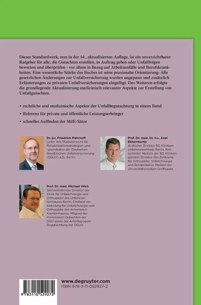 Dieses Standardwerk, nun in der 14., aktualisierten Auflage, ist ein unverzichtbarer Ratgeber für alle, die Gutachten erstellen oder in Auftrag geben oder Unfallfolgen bewerten und überprüfen - vor allem in Bezug auf Arbeitsunfälle und Berufskrankheiten.