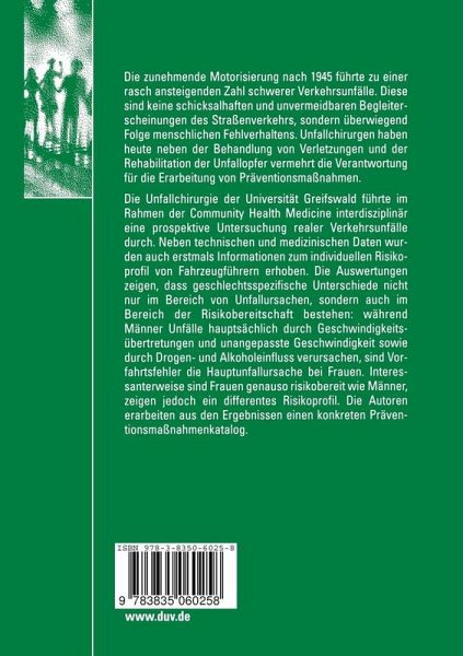 Die Unfallchirurgie der Universität Greifswald führte im Rahmen der Community Health Medicine interdisziplinär eine prospektive Untersuchung realer Verkehrsunfälle durch. Neben technischen und medizinischen Daten wurden auch erstmals Informationen zum individuellen Risikoprofil von Fahrzeugführern erhoben. Die Auswertungen zeigen, dass geschlechtsspezifische Unterschiede nicht nur im Bereich von Unfallursachen, sondern auch im Bereich der Risikobereitschaft bestehen: während Männer Unfälle hauptsächlich durch Geschwindigkeitsübertretungen und unangepasste Geschwindigkeit sowie durch Drogen- und Alkoholeinfluss verursachen, sind Vorfahrtsfehler die Hauptunfallursache bei Frauen. Interessanterweise sind Frauen genauso risikobereit wie Männer, zeigen jedoch ein differentes Risikoprofil. Die Autoren erarbeiten aus den Ergebnissen einen konkreten Präventionsmaßnahmenkatalog.