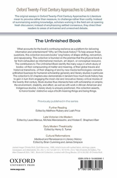 Assessing a wide variety of particular books, book-like objects, and book collections, and working with millennia of variable and conflicting definitions of the book and its purposes, The Unfinished Book surveys the many things that books have been, and uncovers why the book's grip on the cultural imagination remains so tenacious.
