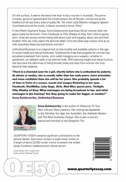 On the surface, it seems the best time ever to be a woman in Australia. The prime minister, governor-general and the richest person are all female; women are at the forefront of almost every area of public life. Yet when Julia Gillard's misogyny speech ricocheted around the world, it clearly touched a nerve. Why? In the fiftieth Quarterly Essay, Anna Goldsworthy examines life for women after the gains made by feminism. From Facebook to 50 Shades of Grey, from Girls to gonzo porn, what are young women being told about work and equality, about sex and their bodies? Why do many reject the feminist label? And why does pop culture wink at us with storylines featuring submissive women? Unfinished Business is an original look at role models and available options in the age of social media and sexual frankness. Goldsworthy finds that progress for women has provoked a backlash from some, who wield misogyny as a weapon, whether in parliament, on talkback radio or as internet trolls. With piercing insight and sharp humour, she lays bare the dilemmas of being female today and asks how women can truly become free subjects. 'There is a charmed zone for a girl, shortly before she is ambushed by puberty. At eleven or twelve, she is usually taller than her male peers; more articulate; and more confident than she will be for years. She probably spends a lot of time in front of a screen, words and images flickering in her eyes. Facebook, Slutwalks, Lady Gaga, Girls, Mad Men, gonzo porn, Twilight, Fifty Shades of Grey. What messages are being broadcast to her, and what messages is she hearing? Are they going to make her bigger, or smaller?' Anna Goldsworthy, Unfinished Business This issue also contains correspondence discussing Quarterly Essay 49, Not Dead Yet, from Andrew Charlton, Jim Chalmers, Peter Brent, Russell Marks, Guy Rundle, Louise Tarrant, Troy Bramston, Nicholas Reece, Mark Latham