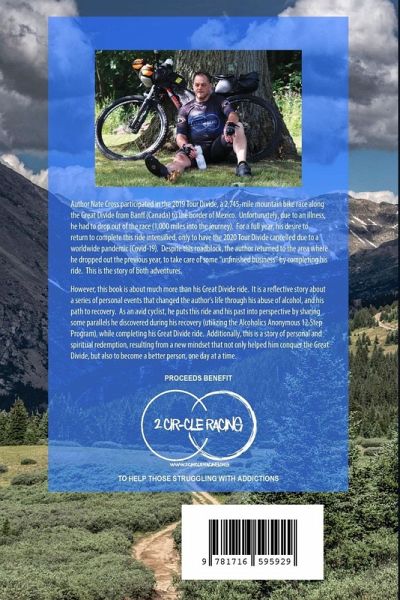 Author Nate Cross participated in the 2019 Tour Divide, a 2,745-mile mountain bike race along the Great Divide from Banff (Canada) to the border of Mexico. Unfortunately, due to an illness, he had to drop out of the race (1,000 miles into the journey). For a full year, his desire to return to complete this ride intensified, only to have the 2020 Tour Divide cancelled due to a worldwide pandemic (Covid-19). Despite this roadblock, the author returned to the area where he dropped out the previous year, to take care of some "unfinished business" by completing his ride. This is the story of both adventures. However, this book is about much more than his Great Divide ride. It is a reflective story about a series of personal events that changed the author's life through his abuse of alcohol, and his path to recovery. As an avid cyclist, he puts this ride and his past into perspective by sharing some parallels he discovered during his recovery (utilizing the Alcoholics Anonymous 12-Step Program), while completing his Great Divide ride. Additionally, this is a story of personal and spiritual redemption, resulting from a new mindset that not only helped him conquer the Great Divide, but also to become a better person, one day at a time. ALL PROCEEDS BENEFIT THOSE IN RECOVERY.