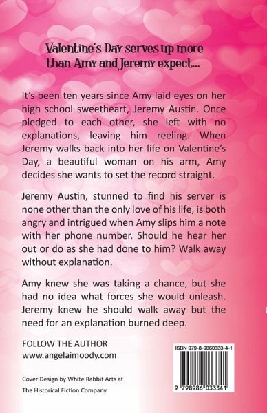 It's been ten years since Amy laid eyes on her high school sweetheart, Jeremy Austin. Once pledged to each other, she left with no explanations, leaving him reeling. When Jeremy walks back into her life on Valentine's Day, a beautiful woman on his arm, Amy decides she wants to set the record straight. Jeremy Austin, stunned to find his server is none other than the only love of his life, is both angry and intrigued when Amy slips him a note with her phone number. Should he hear her out or do as she had done to him? Walk away without explanation. Amy knew she was taking a chance, but she had no idea what forces she would unleash. Jeremy knew he should walk away but the need for an explanation burned deep.