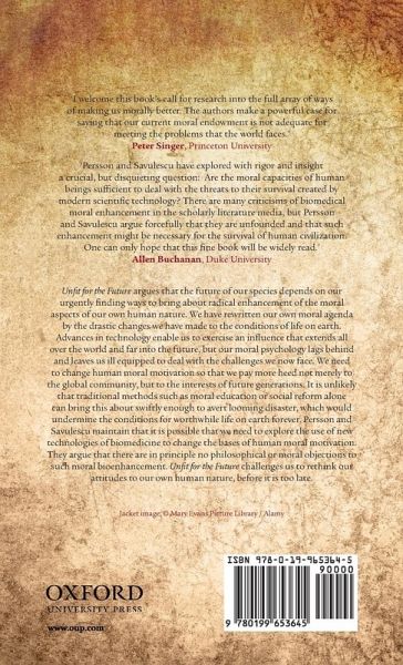 Unfit for the Future argues that the future of our species depends on radical enhancement of the moral aspects of our nature. Population growth and technological advances are threatening to undermine the conditions of worthwhile life on earth forever. We need to modify the biological bases of human motivation to deal with this challenge.
