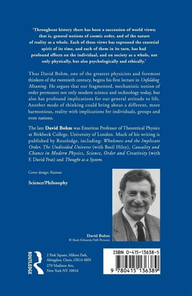 First published in 1987. In Unfolding Meaning, the author, one of the most provocative and original thinkers of our time, argues that there are other ways of thinking to bring about a different, more harmonious reality. Our fragmented, mechanistic notion of order derives from the modem conception that our earth is only part, not - as it was with the Greeks - the centre, of the immense universe of material bodies. The implications of this idea permeate modem science and technology today and also our general attitude to life.