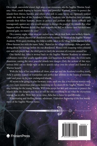 On a small, uneventful island, high atop a vast mountain, sits the Sugilite Warrior Academy. Here, youth hoping to become fierce and powerful Warriors, sworn to protect the islands from thieves, bandits, and others who seek to cause havoc, are rigorously trained under the iron fists of the Academy's Masters. Students vow themselves into servitude towards their fellow humans, sworn to protect and perform their duties selflessly and courageously against any who would attempt to disrupt the peace of the islands. But what happens when Warriors decide that their magnificent skill set is better used for their own personal gain, no matter the cost? On a stormy night, when most are tucked away safe in their beds, two unlikely friends, Oliver and Cashew, discover an abandoned infant outside the doors of the Sugilite Warrior Academy. With quick thinking, the child is swiftly taken to the village below, but not before Oliver bestows her with the name 'Asha'. Raised in the village orphanage, Asha grew wondering about her heritage before she was abandoned. Blessed with stunning violet coloured eyes and rich purple hair, the child grew to catch the attention of everyone around her. One fateful day, Asha is invited back to the Sugilite Warrior Academy to witness a celebration event that usually signifies pride and happiness, but this time, the event turns disastrous, casting the once peaceful islands into danger. Only the actions of this mysterious child can set things right as she is quickly taken into the school and trained as a Warrior herself. With the help of her two finders all those years ago and the Academy's scullery maid, Asha is quickly trained to manipulate and perfect her abilities in the hopes of restoring order and peace to the now endangered islands. All seems to be going to plan for many years, until one day, a mysterious women with an even more mysterious plan come knocking on the doors of the Sugilite Warrior Academy looking for the young Warrior. Will Asha accept her fate and continue to protect the islands from the dangers they face or will she risk everything to see what the mysterious woman has to offer. With little to no time, Asha has a choice to quickly make... A captivating and thrilling fantasy adventure, Unforeseen Beginnings is the first installment of the Sugilite Warrior Series.