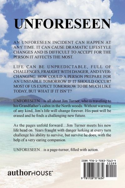 AN UNFORESEEN INCIDENT CAN HAPPEN AT ANY TIME. IT CAN CAUSE DRAMATIC LIFESTYLE CHANGES AND IS DIFFICULT TO ACCEPT FOR THE PERSON IT AFFECTS THE MOST. LIFE CAN BE UNPREDICTABLE, FULL OF CHALLENGES, FRAUGHT WITH DANGER, AND EVER-CHANGING. HOW COULD A PERSON PREPARE FOR AN UNSTABLE TOMORROW IF IT SHOULD OCCUR? MOST OF US EXPECT TOMORROW TO BE MUCH LIKE TODAY, BUT WHAT IF IT ISN'T? UNFORESEEN...is all about Jim Turner, who is traveling to his Grandfather's cabin in the North woods. Without warning of any kind, Jim's life will change forever. His past will be erased and he finds a challenging new future. As the pages unfold forward...Jim Turner meets his new life head on. Years fraught with danger lurking at every turn challenge his ability to survive, but survive he does, with the help of a very caring companion. UNFORESEEN...is a page-turner, filled with action.