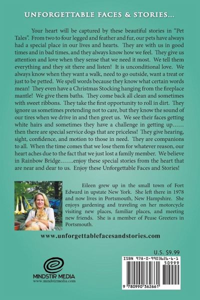 Your heart will be captured by these beautiful stories in "Pet Tales". From two to four legged and feather and fur, our pets have always had a special place in our lives and hearts. They are with us in good times and in bad times, and they always know how we feel. They give us attention and love when they sense that we need it most. We tell them everything and they sit there and listen! It is unconditional love. We always know when they want a walk, need to go outside, want a treat or just to be petted. We spell words because they know what certain words mean! They even have a Christmas Stocking hanging from the fireplace mantle! We give them baths. They come back all clean and sometimes with sweet ribbons. They take the first opportunity to roll in dirt. They ignore us sometimes pretending not to care, but they know the sound of our tires when we drive in and then greet us. We see their faces getting white hairs and sometimes they have a challenge in getting up.... Then there are special service dogs that are priceless! They give hearing, sight, confidence, and motion to those in need. They are companions to all. When the time comes that we lose them for whatever reason, our heart aches due to the fact that we just lost a family member. We believe in Rainbow Bridge...enjoy these special stories from the heart that are near and dear to us. Enjoy these Unforgettable Faces and Stories!