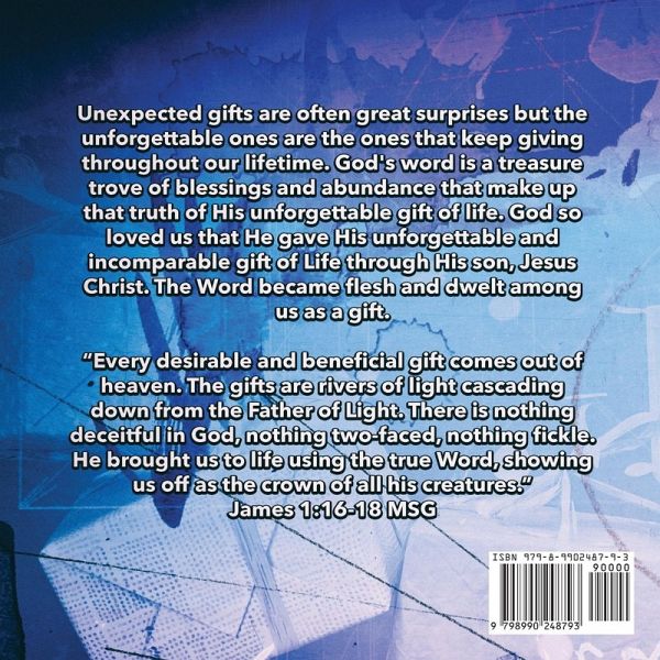 Unexpected gifts are often great surprises but the unforgettable ones are the ones that keep giving throughout our lifetime. God's word is a treasure trove of blessings and abundance that make up that truth of His unforgettable gift of life. God so loved us that He gave His unforgettable and incomparable gift of Life through His son, Jesus Christ. The Word became flesh and dwelt among us as a gift. "Every desirable and beneficial gift comes out of heaven. The gifts are rivers of light cascading down from the Father of Light. There is nothing deceitful in God, nothing two-faced, nothing fickle. He brought us to life using the true Word, showing us off as the crown of all his creatures." James 1 16-18 MSG