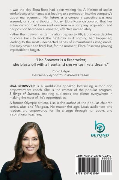 It was the day Elora-Rose had been waiting for. A lifetime of stellar workplace performance was leading to a promotion into the company's upper management. Her future as a company executive was now assured, or so she thought. Today, Elora-Rose discovered that her entire division had been sent overseas in a company acquisition and her position had been eliminated, effective immediately. Rather than deliver her termination papers to HR, Elora-Rose decides to come back to work the next day as if nothing had happened, leading to the most unexpected series of circumstances imaginable. She may have been fired, but, for the moment, Elora-Rose was proving impossible to forget. "Lisa Shawver is a firecracker; she blasts off with a heart and she writes like a dream." Robin Edgar Bestseller Beyond Your Wildest Dreams Lisa Shawver is a world-class speaker, bestselling author and empowerment coach. She is the creator of the popular program, 5 Rings to Success, inspiring audiences and clients everywhere in making the most of life's opportunities. A former Olympic athlete, Lisa is the author of the popular children series, Max and Marigold. No matter the age, Lisa's audiences and readers are empowered for life change through her books and inspirational teaching.