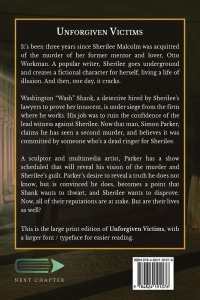 It's been three years since Sherilee Malcolm was acquitted of the murder of her former mentor and lover, Otto Workman. A popular writer, Sherilee goes underground and creates a fictional character for herself, living a life of illusion. And then, one day, it cracks. Washington "Wash" Shank, a detective hired by Sherilee's lawyers to prove her innocent, is under siege from the firm where he works. His job was to ruin the confidence of the lead witness against Sherilee. Now that man, Simon Parker, claims he has seen a second murder, and believes it was committed by someone who's a dead ringer for Sherilee. A sculptor and multimedia artist, Parker has a show scheduled that will reveal his vision of the murder and Sherilee's guilt. Parker's desire to reveal a truth he does not know, but is convinced he does, becomes a point that Shank wants to thwart, and Sherilee wants to disprove. Now, all of their reputations are at stake. But are their lives as well? This is the large print edition of Unforgiven Victims, with a larger font / typeface for easier reading.