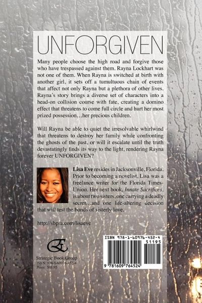 Many people choose the high road and forgive those who have trespassed against them. Rayna Lockhart was not one of them. When Rayna is switched at birth with another girl, it sets off a tumultuous chain of events that affect not only Rayna but a plethora of other lives. Rayna's story brings a diverse set of characters into a head-on collision course with fate, creating a domino effect that threatens to come full circle and hurt her most prized possession, her precious children. Will Rayna be able to quiet the irresolvable whirlwind that threatens to destroy her family while confronting the ghosts of the past, or will it escalate until the truth devastatingly finds its way to the light, rendering Rayna forever UNFORGIVEN? Lisa Eve resides in Jacksonville, Florida. Prior to becoming a novelist, Lisa was a freelance writer for the Florida Times- Union. Her next book, Innate Sacrifices, is about two sisters, one carrying a deadly secret and one life-altering decision that will test the bonds of sisterly love. http://sbpra.com/lisaeve