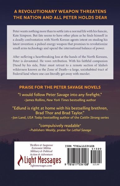 "Dave Edlund is one of the very best all-out, full-bore action thriller writers out there today, and all the reasons why are on full display in Unforgiving Savage." -Jon Land, USA Today bestselling author Peter wants nothing more than to settle into a normal life with his fiancée, Kate Simpson. But fate seems to have other plans as he finds himself in a deadly confrontation with North Korean agents intent on stealing his latest invention: a pulsed energy weapon that promises to revolutionize small arms technology and upend the international balance of power. After suffering a heartbreaking loss at the hands of the North Koreans, Peter is devastated. He vows retribution. With his faithful companion Diesel by his side, Peter must retreat to a remote section of Idaho's wilderness known as the Zone of Death-a large, uninhabited tract of Federal land where one can literally get away with murder. PRAISE FOR THE PETER SAVAGE NOVELS "I would follow Peter Savage into any firefight." -James Rollins, New York Times bestseller of The Demon Crown "compulsively readable" -Publishers Weekly "action on almost every page" -Foreword Reviews "required reading for any thriller aficionado" -Steve Berry, New York Times and #1 international bestselling author "plenty of heart-racing action" -San Francisco Book Review "Edlund's lean prose and whipsmart dialogue propel readers through this frighteningly realistic thriller at a breathtaking pace." -K.J. Howe, international bestselling author of Skyjack PETER SAVAGE NOVELS IN ORDER Each Peter Savage novel can be read as a stand-alone. 1. Crossing Savage 2. Relentless Savage 3. Deadly Savage 4. Hunting Savage 5. Guarding Savage 6. Lethal Savage 7. Valiant Savage 8. Unforgiving Savage
