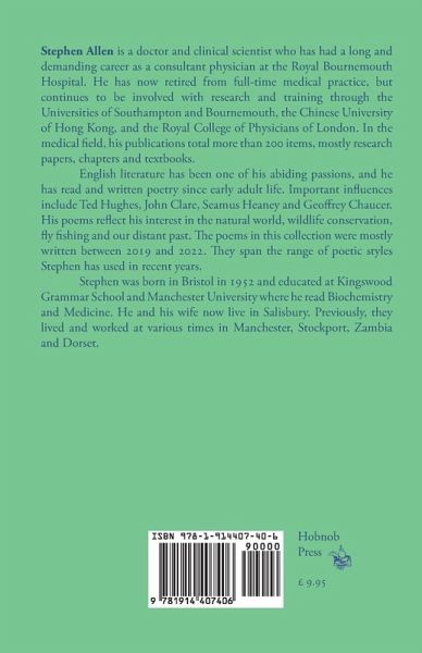 Stephen Allen is a doctor and clinical scientist, now semi-retired, who has had a long and demanding career as a consultant physician, and who has published more than 200 items, mostly research papers, chapters and textbooks. English literature has been one of his abiding passions, and he has read and written poetry since early adult life. His poems reflect his interest in the natural world, wildlife conservation, fly fishing and our distant past. The poems in this collection were mostly written between 2019 and 2022. They span the range of poetic styles Stephen has used in recent years. He and his wife live in Salisbury, in England's West Country, and many of the poems describe or are inspired by the landscapes of the region.
