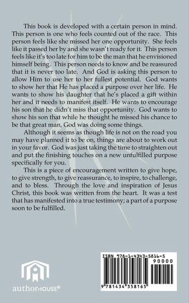 This book is developed with a certain person in mind. This person is one who feels counted out of the race. This person feels like she missed her one opportunity. She feels like it passed her by and she wasn't ready for it. This person feels like it's too late for him to be the man that he envisioned himself being. This person needs to know and be reassured that it is never too late. And God is asking this person to allow Him to use her to her fullest potential. God wants to show her that He has placed a purpose over her life. He wants to show his daughter that he's placed a gift within her and it needs to manifest itself. He wants to encourage his son that he didn't miss that opportunity. God wants to show his son that while he thought he missed his chance to be that great man, God was doing some things. Although it seems as though life is not on the road you may have planned it to be on, things are about to work out in your favor. God was just taking the time to straighten out and put the finishing touches on a new unfulfilled purpose specifically for you. This is a piece of encouragement written to give hope, to give strength, to give reassurance, to inspire, to challenge, and to bless. Through the love and inspiration of Jesus Christ, this book was written from the heart. It was a test that has manifested into a true testimony; a part of a purpose soon to be fulfilled.