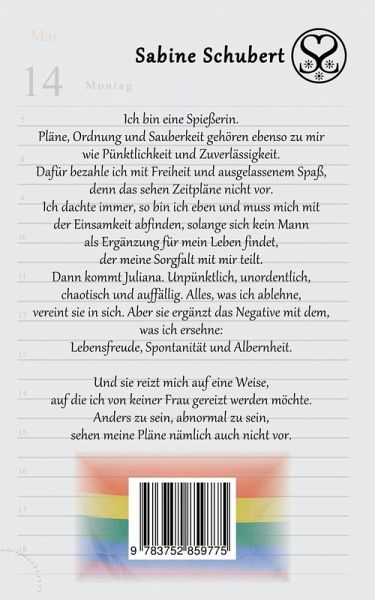 Ich bin eine Spießerin. Pläne, Ordnung und Sauberkeit gehören ebenso zu mir wie Pünktlichkeit und Zuverlässigkeit. Dafür bezahle ich mit Freiheit und ausgelassenem Spaß, denn das sehen Zeitpläne nicht vor. Ich dachte immer, so bin ich eben und muss mich mit der Einsamkeit abfinden, solange sich kein Mann als Ergänzung für mein Leben findet, der meine Sorgfalt mit mir teilt. Und dann kommt Juliana. Unpünktlich, unordentlich, chaotisch und auffällig. Alles, was ich ablehne, vereint sie in sich. Aber sie ergänzt das Negative mit dem, was ich ersehne: Lebensfreude, Spontanität und Albernheit. Und sie reizt mich auf eine Weise, auf die ich von keiner Frau gereizt werden möchte. Anders zu sein, abnormal zu sein, sehen meine Pläne nämlich auch nicht vor.