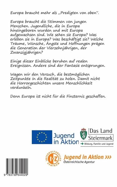 Europa braucht mehr, als "Predigten von oben". Europa braucht die Stimmen von jungen Menschen. Jugendliche, die in Europa hineingeboren wurden und mit Europa aufgewachsen sind. Wie sehen sie Europa? Was erleben sie in Europa? Was beschäftigt sie? Welche Träume, Wünsche, Ängste und Hoffnungen prägt die Generation der Vierzehnjährigen, der Zwanzigjährigen?Einige dieser Einblicke beruhen auf realen Ereignissen. Andere sind der Fantasie entsprungen.Wagen wir den Versuch, die bestmöglichen Zeitpunkte in die Realität zu holen. Damit nicht die Horrorgeschichten unsere Menschlichkeit verdunkeln. Denn Europa ist nicht für die Finsternis geschaffen.