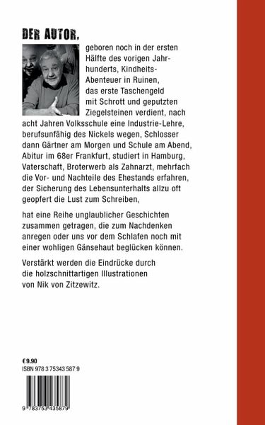 Wolf Schillinger, geboren gerade noch in der ersten Hälfte des letzten Jahrhunderts, Kindheits-Abenteuer in Ruinen, mit Schrott und Ziegelsteinen das erste Taschengeld verdient, nach acht Jahren Volksschule eine Industrie-Facharbeiter-Lehre, nach dem Abschluss berufsunfähig, Schlosser dann und nach dem Militärdienst Gärtner am Morgen, Schule am Abend, Abitur im 68er Frankfurt, Studium in Hamburg, Vaterschaft, Broterwerb als Zahnarzt, die Vor- und Nachteile des Ehestands mehrfach erfahren, zu oft der Sicherung des Lebensunterhalts die Lust zum Schreiben geopfert.