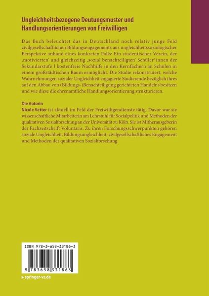Einleitung.- Soziale Ungleichheit in der modernen Gesellschaft: Definition, normative Legitimation und Wahrnehmung.- Bürgerschaftliches Engagement - Einordnung des Falls in den Themenkontext.- Methodologische Fundierung - Sensibilisierende Konzepte und integrativer Ansatz.- Anlage der empirischen Untersuchung und methodische Vorgehensweise.- Deutungsmuster sozialer (Bildungs-)Ungleichheit.- Ehrenamtliche Handlungsorientierung.- Dynamische Betrachtung von Deutungsmustern und Agencies.- Schlussfolgerungen.