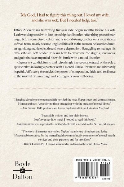 "My God, I had to figure this thing out. I loved my wife, and she was sick. But I needed help, too." Jeffrey Zuckerman's harrowing five-year ride began months before his wife Leah was diagnosed with late-onset bipolar disorder. After thirty years of marriage, Jeff, a semi-retired editor and a second-string catcher on a recreational softball team, nearly became unglued himself as the woman he loved endured an agonizing manic episode and severe depression. Struggling to manage his own self-care, Jeff needed to learn how to overcome the stigma, loneliness, and guilt that accompanied his wife's battle with a mood disorder. Unglued is a candid, funny, and refreshingly irreverent portrayal of the role a spouse takes in loving a partner with a mental illness. Intimate and ultimately hopeful, Jeff's story chronicles the power of compassion, faith, and resilience in the survival of a marriage and a caregiver's own well-being. Unglued was a finalist in the Minnesota Book Awards and was shortlisted for the Eric Hoffer Award.