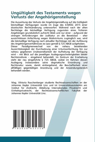 Die Auswirkung des Verlusts der Angehörigenstellung auf die Gültigkeit letztwilliger Verfügungen wurde im Zuge des ErbRÄG 2015 einer drastischen Rechtsänderung unterworfen: Während nach der alten Rechtslage die letztwillige Verfügung zugunsten eines früheren Angehörigen grundsätzlich aufrecht blieb und nur einer - aufgrund der strengen Anforderungen der Judikatur an die Beweislast - eher aussichtslosen Anfechtung wegen Motivirrtums zugänglich war, wird die letztwillige Verfügung nach aktueller Rechtslage mit der Auflösung des Angehörigenverhältnisses eo ipso gemäß § 725 ABGB aufgehoben. Dieser Paradigmenwechsel von der nahezu bestehenden Aussichtslosigkeit der Durchsetzung einer Irrtumsanfechtung hin zur nahezu gegebenen Unabwendbarkeit der Aufhebung der Verfügung wird - mit Blick auf die jeweiligen Auslegungsschwierigkeiten beider Rechtsinstitute - eingehend behandelt. Im Zentrum der Erarbeitung steht der neu eingeführte § 725 ABGB, wobei im Rahmen dessen Auslegung insbesondere seine dogmatische Einordnung und Rechtsnatur sowie, damit einhergehend, die Beschaffenheit einer allfälligen gegenteiligen Anordnung und der Anwendungsbereich behandelt werden.