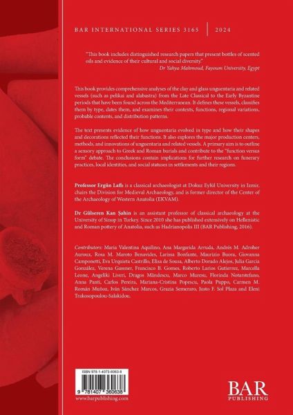 This book provides comprehensive analyses of the clay and glass unguentaria and related vessels (such as pelikai and alabastra) from the Late Classical to the Early Byzantine periods that have been found across the Mediterranean. It defines these vessels, classifies them by type, dates them, and examines their contexts, functions, regional variations, probable contents, and distribution patterns. The text presents evidence of how unguentaria evolved in type and how their shapes and decorations reflected their functions. It also explores the major production centers, methods, and innovations of unguentaria and related vessels. A primary aim is to outline a sensory approach to Greek and Roman burials and contribute to the "function versus form" debate. The conclusions contain implications for further research on funerary practices, local identities, and social statuses in settlements and their regions.