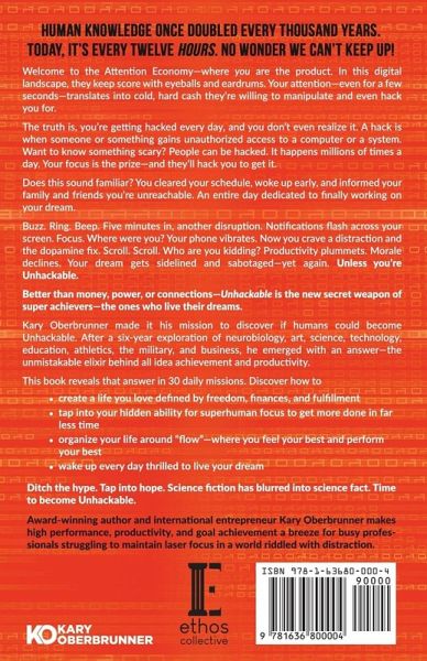 Wall Street Journal and USA Today Best Seller Human knowledge once doubled every thousand years. Today, it's every twelve hours. No wonder we can't keep up! Welcome to the Attention Economy-where you are the product. In this digital landscape, they keep score with eyeballs and eardrums. Your attention-even for a few seconds-translates into cold, hard cash they're willing to manipulate and even hack you for. The truth is, you're getting hacked every day, and you don't even realize it. A hack is when someone or something gains unauthorized access to a computer or a system. Want to know something scary? People can be hacked. It happens millions of times a day. Your focus is the prize-and they'll hack you to get it. Does this sound familiar? You cleared your schedule, woke up early, and informed your family and friends you're unreachable. An entire day dedicated to finally working on your dream. Buzz. Ring. Beep. Five minutes in, another disruption. Notifications flash across your screen. Focus. Where were you? Your phone vibrates. Now you crave a distraction and the dopamine fix. Scroll. Scroll. Who are you kidding? Productivity plummets. Morale declines. Your dream gets sidelined and sabotaged-yet again. Unless you're Unhackable. Better than money, power, or connections-Unhackable is the new secret weapon of super achievers-the ones who live their dreams. Kary Oberbrunner made it his mission to discover if humans could become Unhackable. After a six-year exploration of neurobiology, art, science, technology, education, athletics, the military, and business, he emerged with an answer-the unmistakable elixir behind all idea achievement and productivity. This book reveals that answer in 30 daily missions. Discover how to · create a life you love defined by freedom, finances, and fulfillment · tap into your hidden ability for superhuman focus to get more done in far less time · organize your life around "flow"-where you feel your best and perform your best · wake up every day thrilled to live your dream Ditch the hype. Tap into hope. Science fiction has blurred into science fact. Time to become Unhackable. Award-winning author and international entrepreneur Kary Oberbrunner makes high performance, productivity, and goal achievement a breeze for busy professionals struggling to maintain laser focus in a world riddled with distraction.