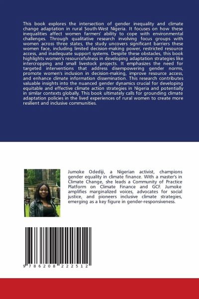 This book explores the intersection of gender inequality and climate change adaptation in rural South-West Nigeria. It focuses on how these inequalities affect women farmers' ability to cope with environmental challenges. Through qualitative research involving focus groups with women across three states, the study uncovers significant barriers these women face, including limited decision-making power, restricted resource access, and inadequate support systems. Despite these obstacles, this book highlights women's resourcefulness in developing adaptation strategies like intercropping and small livestock projects. It emphasizes the need for targeted interventions that address disempowering gender norms, promote women's inclusion in decision-making, improve resource access, and enhance climate information dissemination. This research contributes valuable insights into the nuanced gender dynamics crucial for developing equitable and effective climate action strategies in Nigeria and potentially in similar contexts globally. This book ultimately calls for grounding climate adaptation policies in the lived experiences of rural women to create more resilient and inclusive communities.