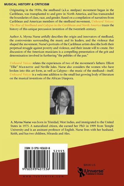 Originating in the 1930s, the steelband (a.k.a. steelpan) movement began in the Caribbean, was transplanted to and grew in North America, and has transcended the boundaries of class, race, and gender. Based on a compilation of narratives from Caribbean and American members of the steelband movement, Unheard Voices: The Rise of Steelband and Calypso in the Caribbean and North America traces the history of this unique percussion invention of the twentieth century. Author A. Myrna Nurse artfully describes the origin and innovators of steelband, the controversies surrounding the music and its leaders, and the violence that shaped the movement. Nurse's portraits of the Caribbean artists describe both their perpetual struggle against poverty and violence, and their innate will to create. Her discussion of the American musicians is a compelling presentation of the grit and determination involved in furthering "the pebbles of the pan." Unheard Voices relates the experiences of two of the movement's fathers: Elliott "Ellie" Mannette and Neville Jules. Nurse also considers the women who have broken into this art form, as well as Calypso-the music of the steelband-itself. Unheard Voices is a welcome addition to the small but growing body of literature on the musical inventions of the African Diaspora.